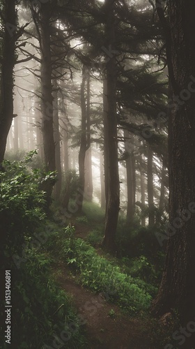 © Woranuch, Fototapeta premium Misty Forest Path A Serene Woodland Trail on a Foggy Day.