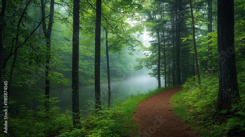 © BerkahStock, Obraz premium Misty forest path alongside calm lake.