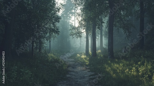 Obraz premium Misty forest path at sunrise, sunlight filtering through trees.