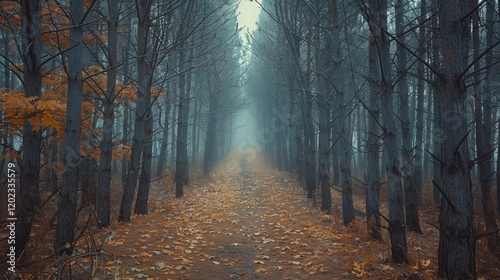 Naklejka premium Misty Forest Path Capturing Serene Autumn Morning Atmosphere