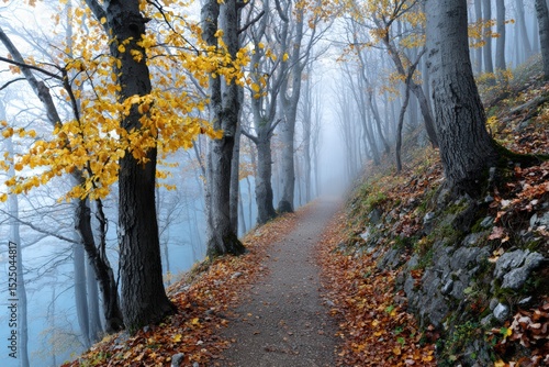 © Olha, Obraz premium Misty forest path covered in golden autumn leaves Generative AI