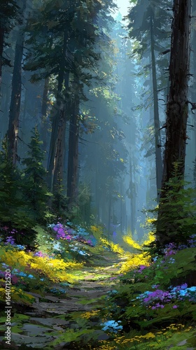 © Lilyterompet, Obraz premium Misty forest path filled with wildflowers