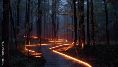 Obraz premium Misty forest path, glowing orange (1)