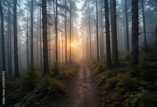Naklejka premium Misty Forest Path: Golden Hour Sunrise Landscape Photography