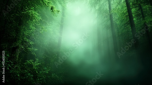 © Narongsag, Naklejka premium Misty Forest Path Green Trees Fog Nature Woodland Mystical Atmospheric Serene Tran