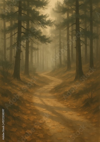 Naklejka premium Misty forest path in autumn.