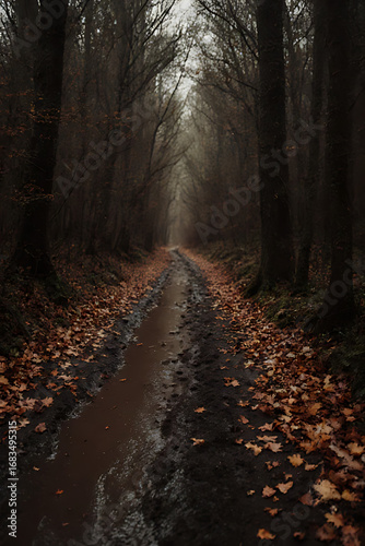 Obraz premium Misty Forest Path in Autumn – Dark and Mysterious Wood Trail