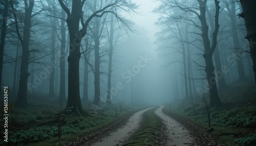 © Kitta Studio, Naklejka premium Misty Forest Path in Autumn with Fog and Tall Trees at Dusk