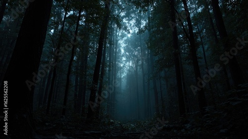 © twilight mist, Fototapeta premium Misty forest path in deep shadows.