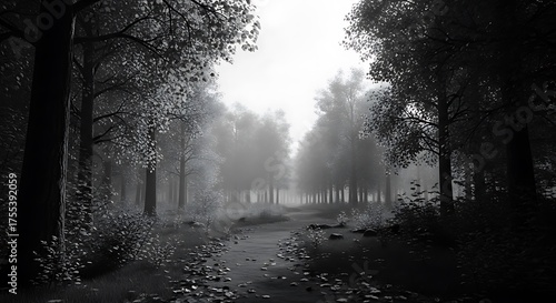 Obraz premium Misty forest path in grayscale
