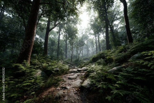 © วัชรินทร์ วรโชติธนนั, Fototapeta premium Misty Forest Path in Lush Greenery and Sunlight