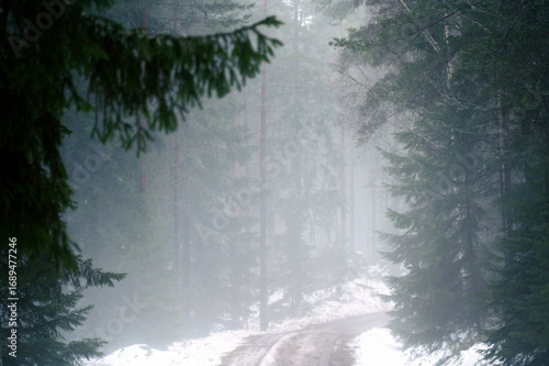 Naklejka premium Misty Forest Path in Winter
