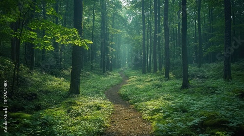 © logyartstudios, Obraz premium Misty forest path leading into deep woods.