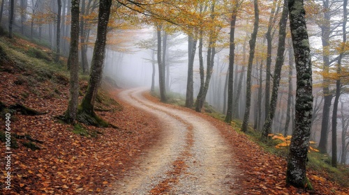 © Roey, Fototapeta premium Misty Forest Path Leading into the Unknown