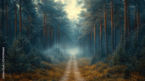 © boler, Obraz premium Misty Forest Path Leading Through Tall Pine Trees