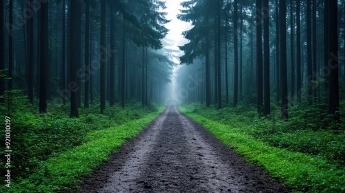© Wed, Obraz premium Misty Forest Path Leading Through Tall Pines.