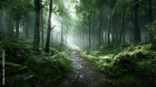Fototapeta premium Misty forest path lined with young sapling and lush green undergrowth, sunbeams filtering through tall trees creating serene nature scene and soft atmospheric light