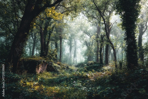 © ceradan, Fototapeta premium Misty forest path. Lush foliage, dappled light filters through trees