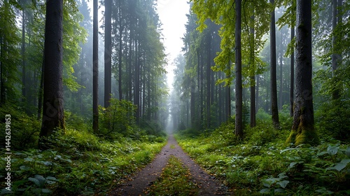Fototapeta premium Misty forest path. Lush greenery, tall trees line a pathway
