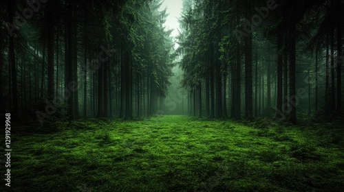 Fototapeta premium Misty forest path, moss, trees, nature, background for fantasy, tranquility
