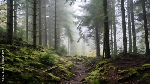 Fototapeta premium Misty Forest Path Mossy Trees Enchanting Scene