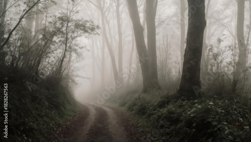 Naklejka premium Misty Forest Path on a Foggy Morning with Sunlight Filtering Through Trees.