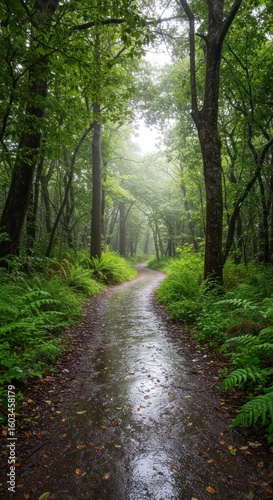 © Subu.STD, Fototapeta premium Misty forest path, rain