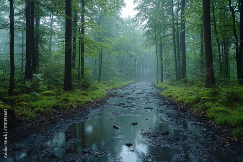 © Myartsam Design, Obraz premium Misty Forest Path Reflecting Water Puddle