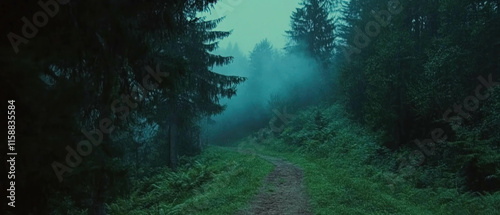 Obraz premium Misty forest path reveals tranquility and mystery in the early morning light