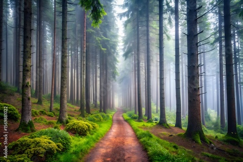 Obraz premium Misty Forest Path: Serene, Lush Green Coniferous Trees, Magical Atmosphere,...