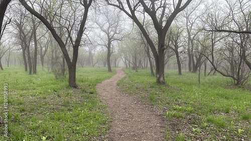 Obraz premium Misty Forest Path Serene Spring Walk Through Woods