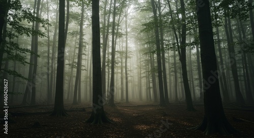 © Ascents, Fototapeta premium Misty forest path, shadowy trees and sunlight.