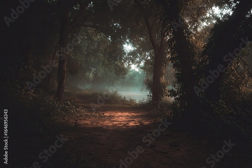 © Bahlil, Obraz premium Misty forest path, sunlight filtering through trees (1)
