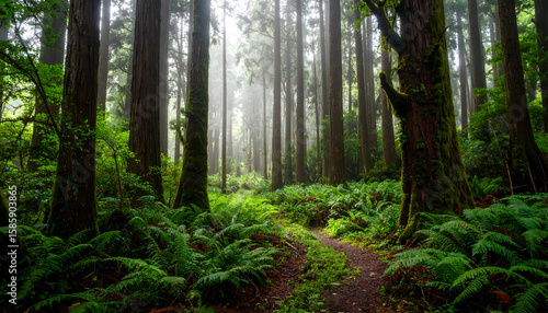 © Wakidi, Fototapeta premium Misty Forest Path Sunlight Through Tall Trees Lush Green Vegetation