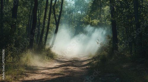 © dominic, Fototapeta premium Misty Forest Path Sunlight, Trees, Dust, Shadows, and Mystery