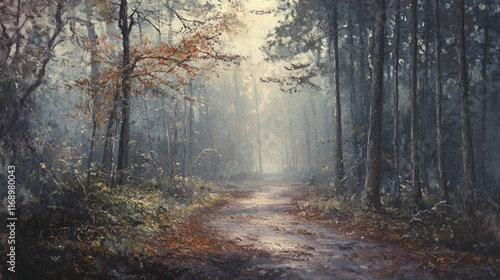 © THUA, Obraz premium misty forest path surrounded by trees and autumn foliage creates serene atmosphere