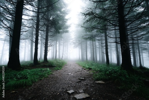 Obraz premium Misty Forest Path Through Ancient Woods - A mysterious path winds through a misty forest, symbolizing mystery, adventure, serenity, solitude, and the unknown