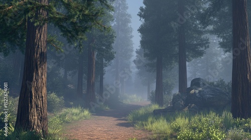 © Sushano, Obraz premium Misty Forest Path Through Giant Trees