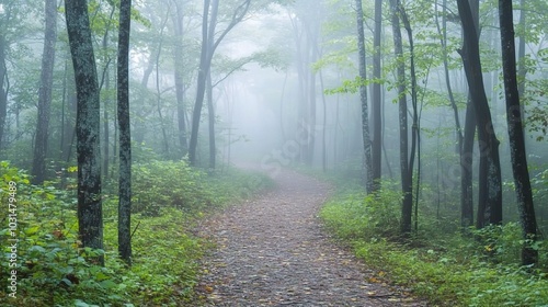 Obraz premium Misty Forest Path Through Lush Green Trees