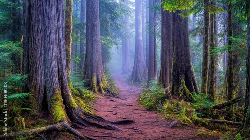 © Rere_Art151, Obraz premium Misty Forest Path Through Tall Ancient Trees