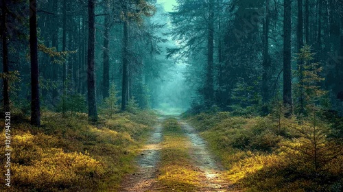© Biancaart, Obraz premium Misty Forest Path Through Tall Dark Trees