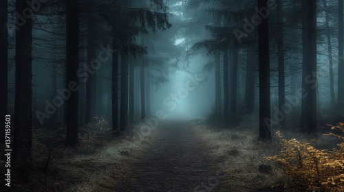 © Murda, Naklejka premium Misty forest path through tall dark trees