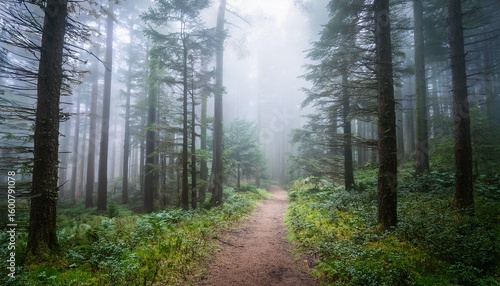© Crystal, Fototapeta premium misty forest path through tall evergreens