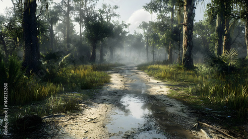Obraz premium Misty Forest Path Under Sunny Daylight