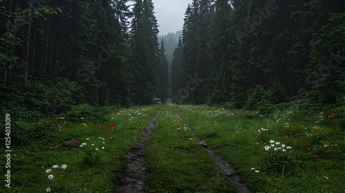 © MAKASIHMAS SIDNEY, Fototapeta premium Misty forest path, wildflowers, cabin, tranquil scene; nature wallpaper
