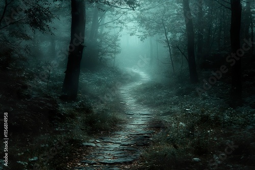 © Yuliana, Naklejka premium Misty Forest Path Winding Deep Into Woods