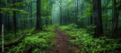 Fototapeta premium Misty forest path winding through a lush verdant landscape of towering trees and vibrant foliage creating a serene enchanting and atmospheric natural setting that invites and discovery