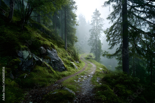 © ParvezPro, Obraz premium Misty forest path winding through lush green mossy trees