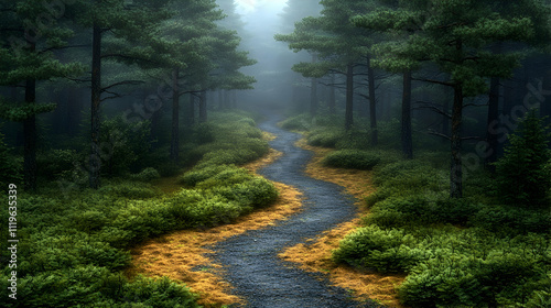 Obraz premium Misty forest path winding through lush greenery.