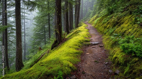 © syifa, Fototapeta premium Misty forest path winding through mossy hillside